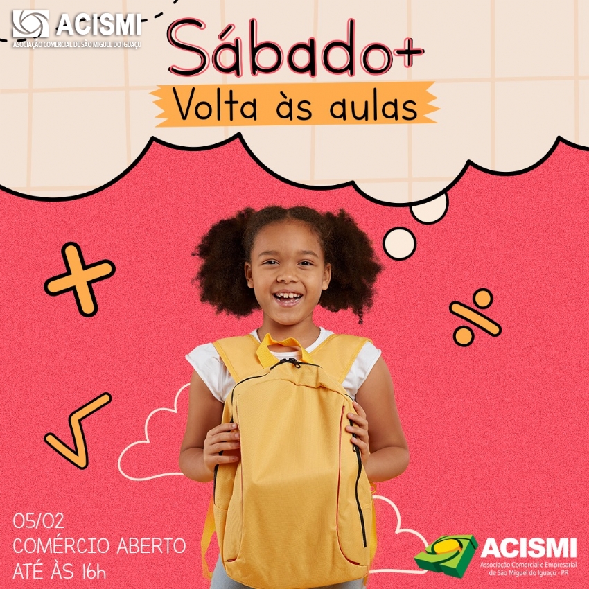 A Associação Comercial e Empresarial de São Miguel do Iguaçu (ACISMI) informa que neste sábado (05) o comércio da cidade vai atender até às 16h. É o Sábado Mais, projeto desenvolvido pela Associação com o objetivo de proporcionar um tempo a mais para o consumidor fazer suas compras.