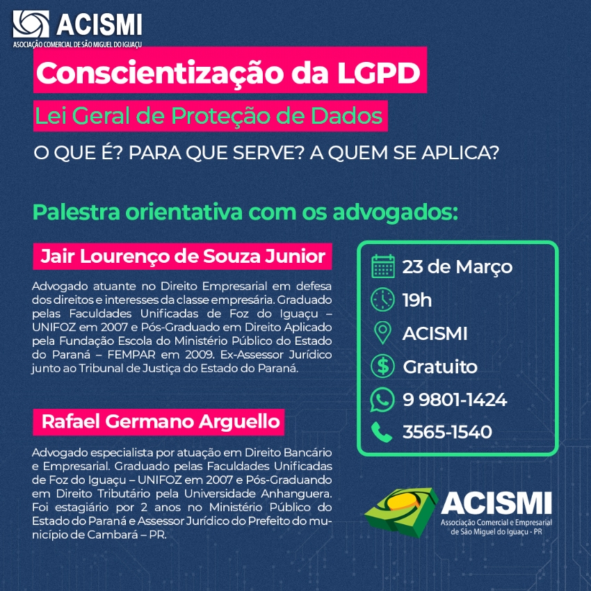 A Associação Comercial e Empresarial de São Miguel do Iguaçu (ACISMI) observando que grande parte dos empresários não tem conhecimento sobre a LGPD e preocupada com os riscos e multas que as empresas podem vir a receber por não estarem adequadas à Lei realizará no dia 23 de março uma palestra orientativa sobre Lei Geral de Proteção de Dados (LGPD). O evento será realizado no auditório da entidade onde os participantes serão recepcionados a partir das 19h e a palestra iniciará às 19h30.