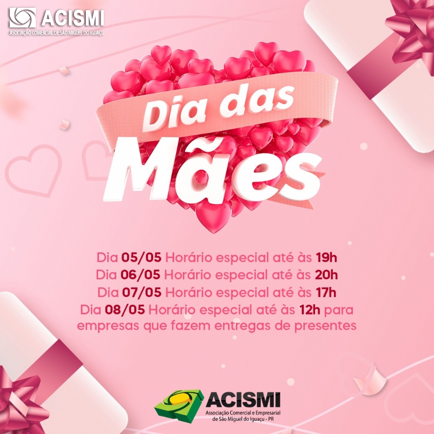A Associação Comercial e Empresarial de São Miguel do Iguaçu (ACISMI) informa que, nesta semana do Dia das Mães. o Comércio da cidade vai funcionar em horário especial.