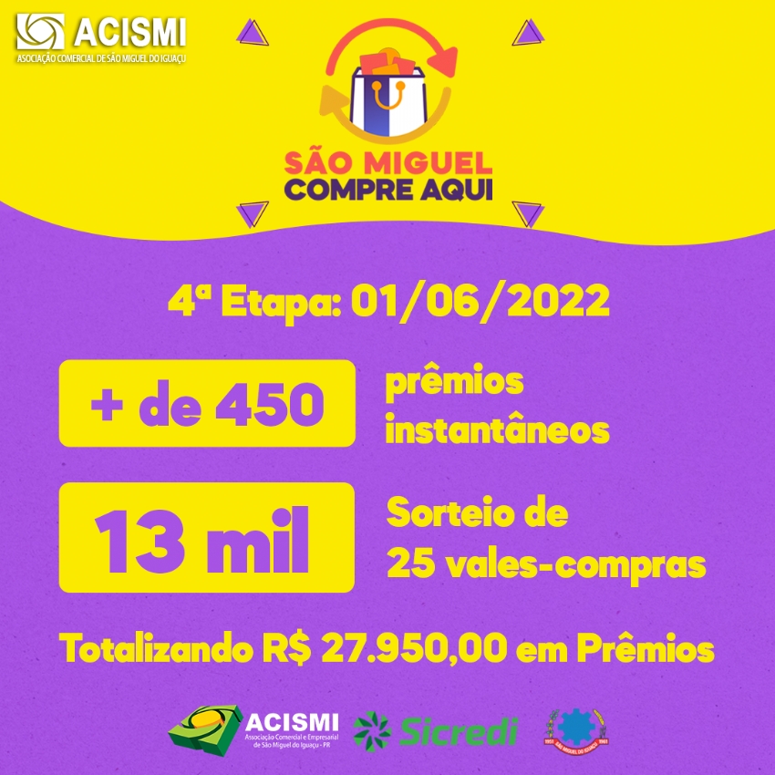 A Associação Comercial e Empresarial de São Miguel do Iguaçu (ACISMI) inicia nessa quarta, 01, a quarta e última etapa da campanha “São Miguel Compre Aqui”. Serão R$ 27.950,00 em prêmios instantâneos e vales-compras.
