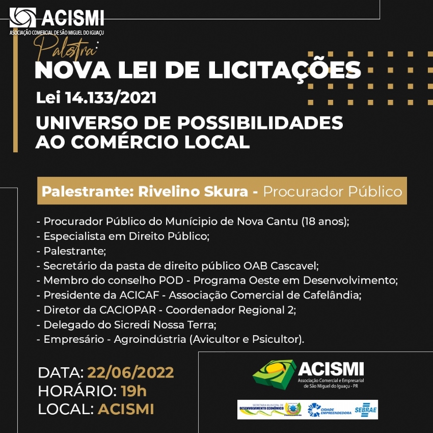A Associação Comercial e Empresarial de São Miguel do Iguaçu (ACISMI) promove gratuitamente no dia 22 de junho a palestra “Nova Lei de Licitações”, Lei 14.133/2021. O evento será na sede da Acismi a partir das 19h00 e os interessados devem se inscrever pelo 3565-1540.