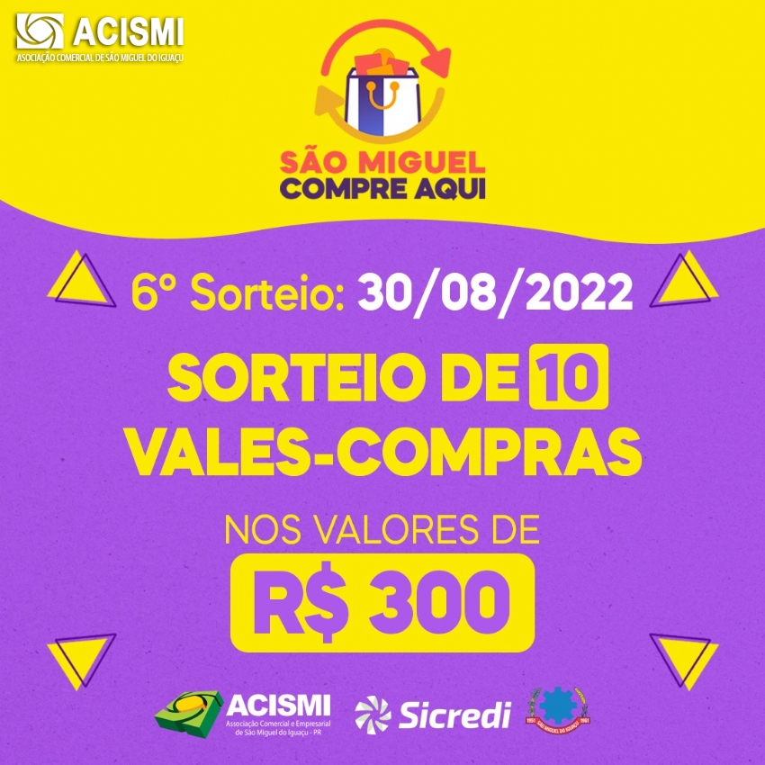 A Associação Comercial e Empresarial de São Miguel do Iguaçu (ACISMI) realiza nessa terça, 30, o 6º e último sorteio da campanha ‘São Miguel Compre Aqui’. Serão 10 vales-compras no valor de R$ 300,00 cada. O sorteio será às 16h com transmissão ao vivo pela página do Facebook da Associação.