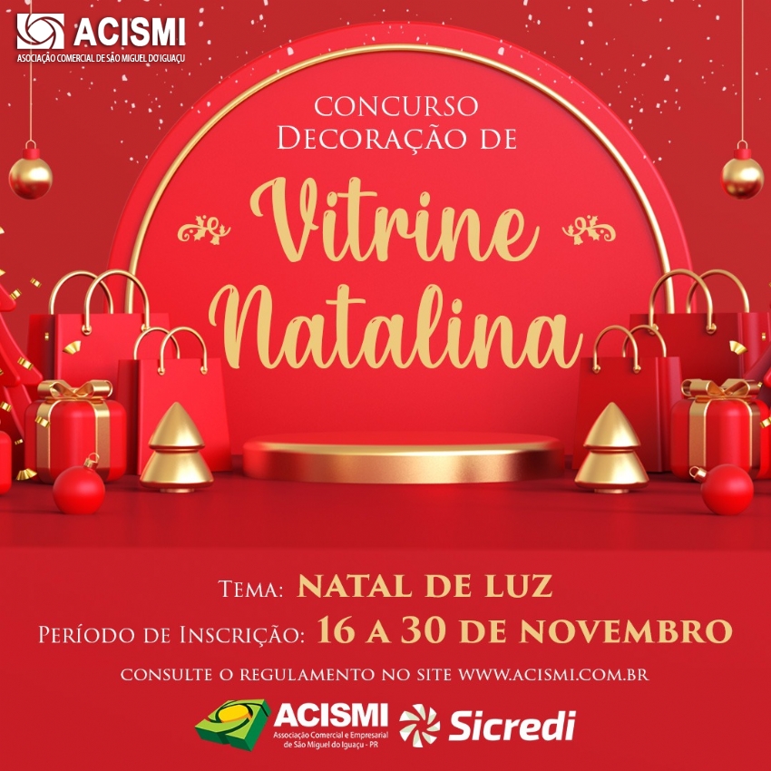 A Associação Comercial e Empresarial de São Miguel do Iguaçu (ACISMI) como o apoio da Sicredi, lançou o Concurso "Decoração de Vitrine Natalina 2022". As inscrições são gratuitas e serão realizadas de 16 a 30 de novembro, por meio de ficha de inscrição.