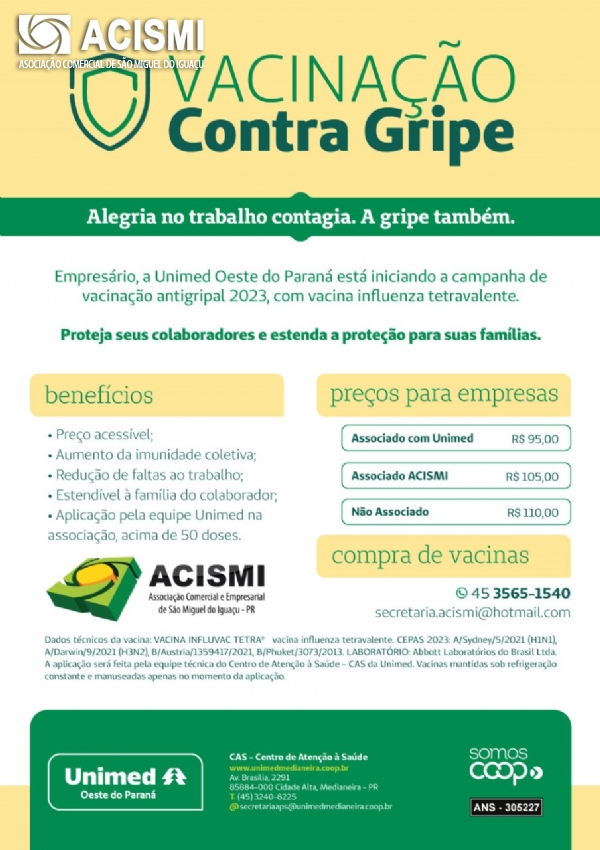A Associação Comercial e Empresarial de São Miguel do Iguaçu (ACISMI) e a UNIMED Oeste do Paraná fecharam uma parceria para a realização da Campanha de Vacinação contra o vírus da Influenza (gripe) 2023.
