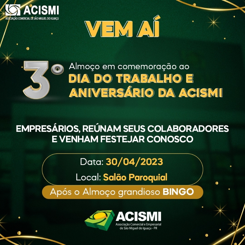 Em comemoração aos 47 anos de Fundação, 01 de maio, a Associação Comercial e Empresarial de São Miguel do Iguaçu (ACISMI) vai realizar no domingo, 30 de abril, o 3º almoço do Trabalhador no Salão Paroquial.