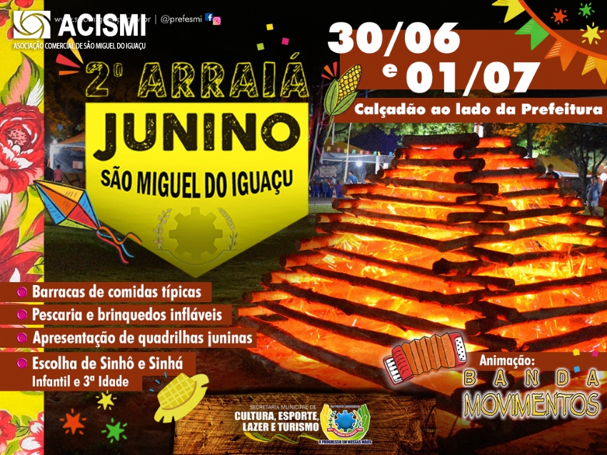 A Associação Comercial e Empresarial de São Miguel do Iguaçu (ACISMI) convida lojistas para participar nos dias 30/06 e 01/07 do 2º Arraiá Junino de São Miguel do Iguaçu, evento realizado pelo Governo Municipal.