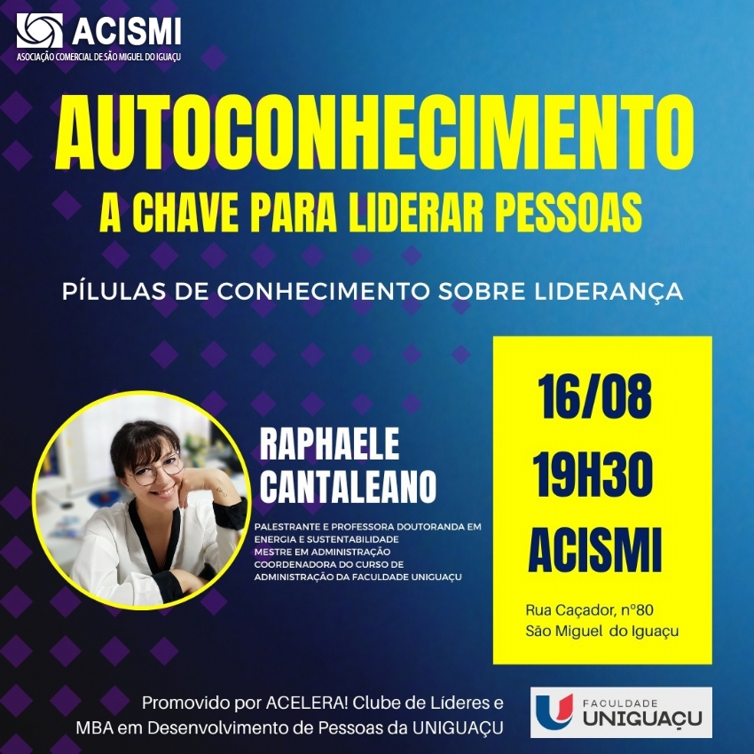 A Associação Comercial e Empresarial de São Miguel do Iguaçu (ACISMI) e a Faculdade Uniguaçu promovem no dia 16 de agosto a palestra ‘Autoconhecimento, a chave para liderar pessoas’, na sede da Acismi com início às 19h30.
