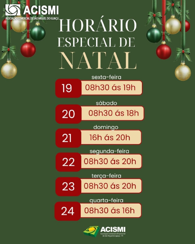 A Associação Comercial e Empresarial de São Miguel do Iguaçu (ACISMI) anuncia o horário especial para o Natal 2025, visando melhor atender nossos clientes neste período de festas.