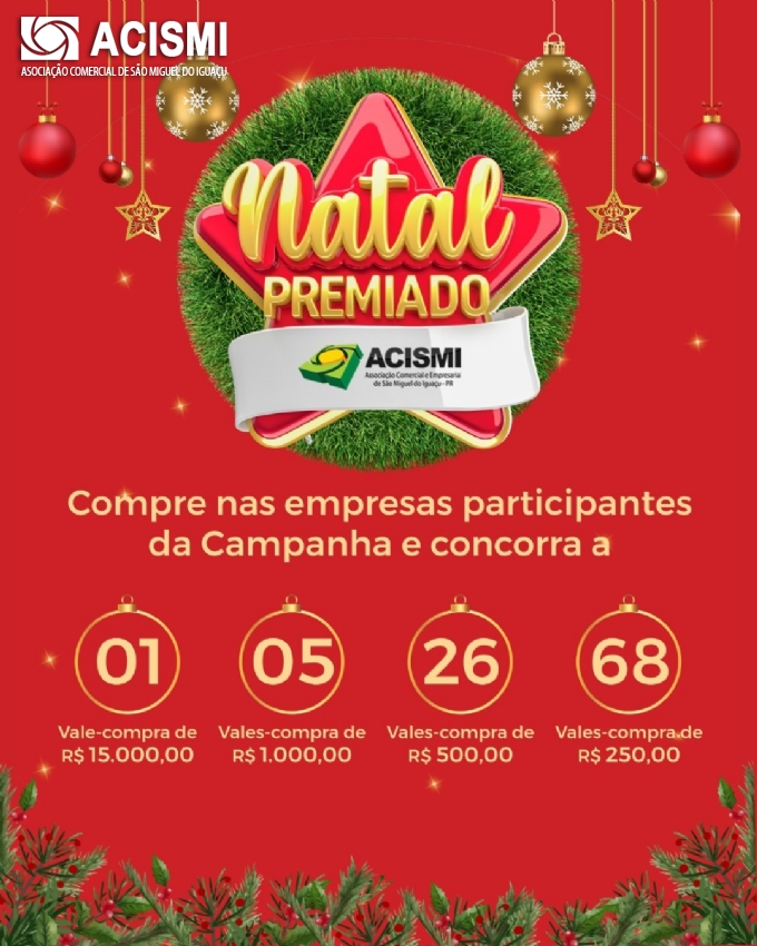 A Associação Comercial e Empresarial de São Miguel do Iguaçu (ACISMI), informa que a Campanha “Natal Premiado” está terminando e o prazo final para a entrega dos cupons é dia 10 de janeiro.