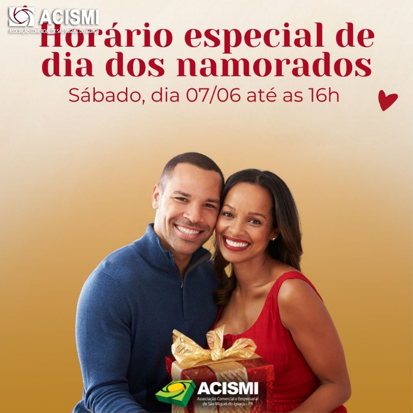 A Associação Comercial e Empresarial de São Miguel do Iguaçu (ACISMI) informa que neste sábado, 07, o comércio da cidade vai atender até as 16horas, em virtude do dia dos namorados (12 de junho).